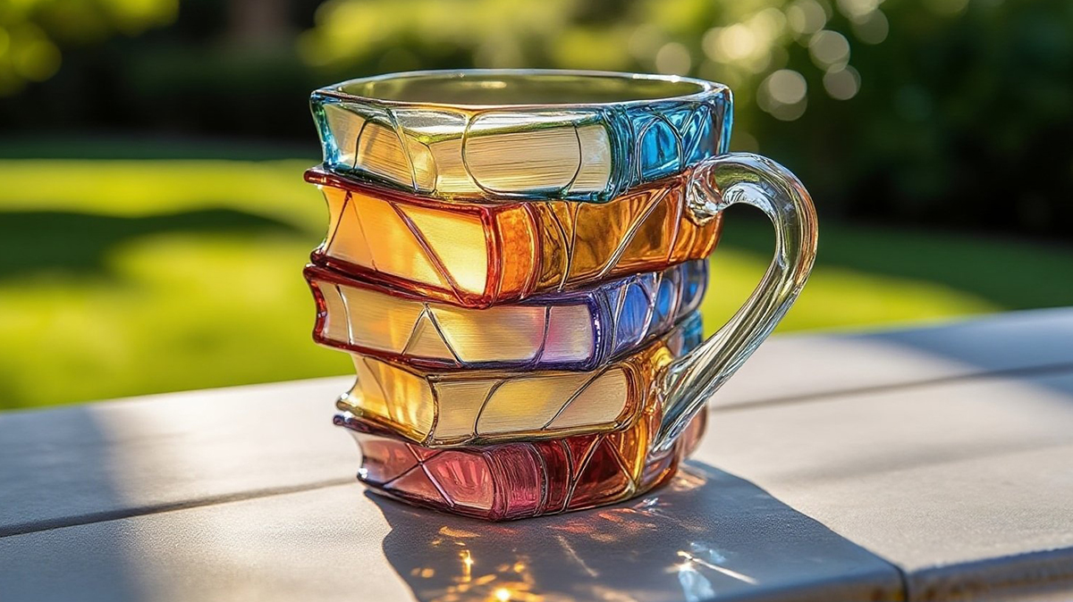 Each mug is individually hand-finished by artisans, giving it a luminous, book-spine texture that glows beautifully in the light—almost like it's holding stories within the glass. It's both functional and enchanting, holding 11oz of your favorite drink while being microwave- and dishwasher-safe for everyday use.